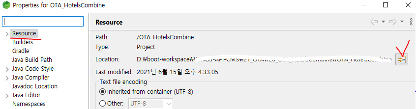 1) project 우클릭 → Properties → Resources → 해당 프로젝트 폴더로 이동한다