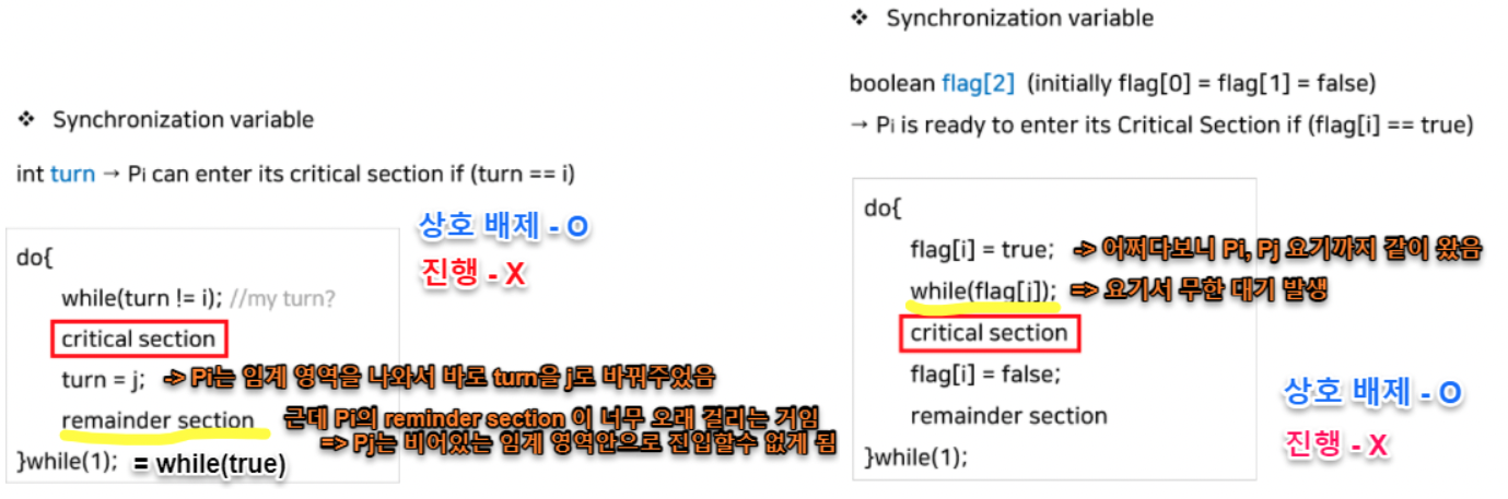 => 모든 프로세스가 읽을 수 있는 공유 변수(Synchronization variable)를 놓고 알고리즘을 설계하기 시작