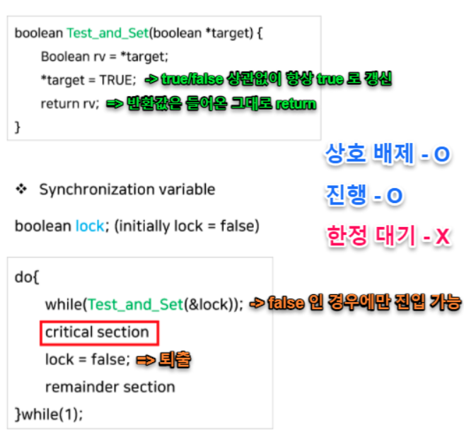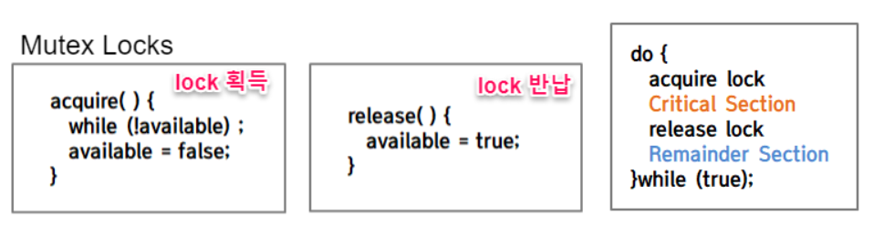 (lock을 얻지 못하여 Critical section에 들어가지 못하는 동안 acquire 함수 내에서 while문을 돌고 있어야 함 = Spin Lock)